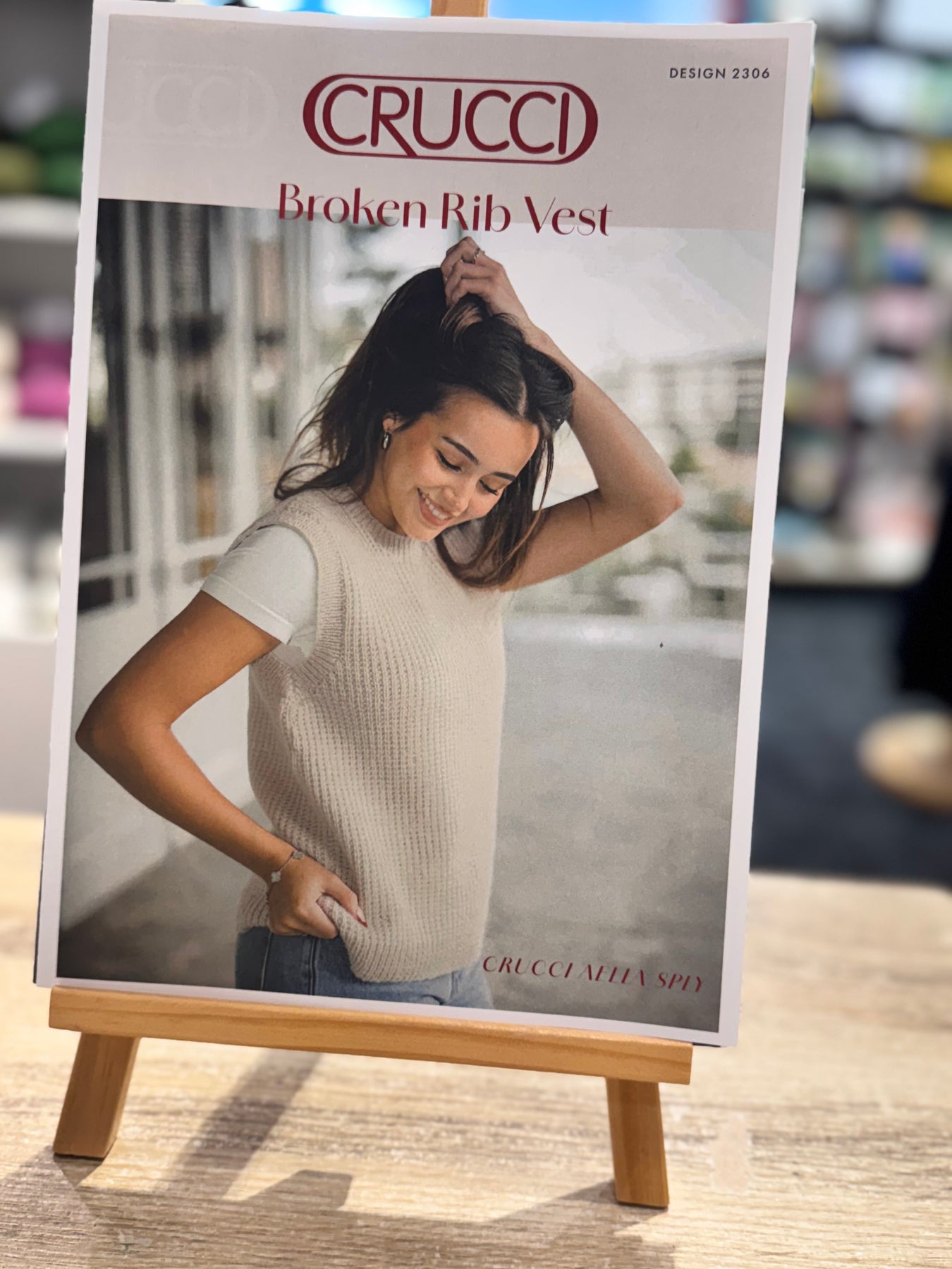 Crucci Aella 8ply is a lovely soft yarn that shows off stitch patterns beautifully — perfect for this vest.