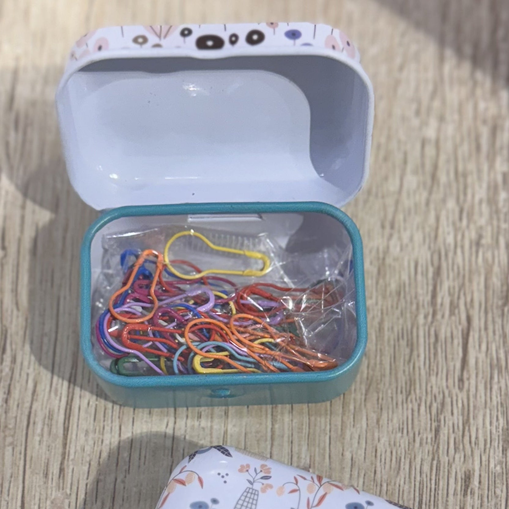 This pretty little tin contains 50 metal coloured "closed metal pin" style stitch markers, so you'll finally have enough for all of your projectsΒ