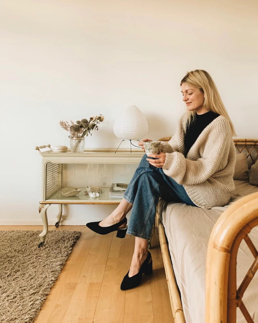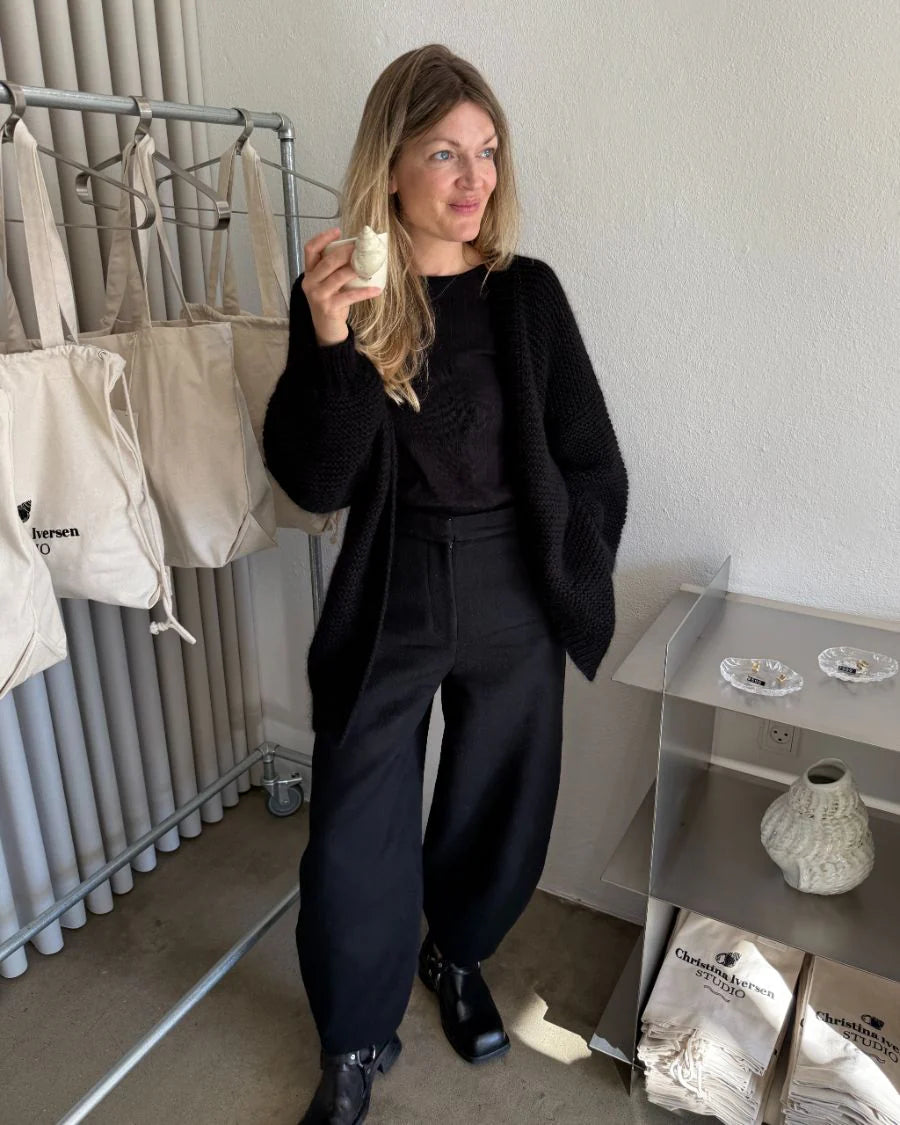 The Balloon Jacket is a relaxed, oversized cardigan with dramatic balloon sleeves and a clean, button-free finish. It’s worked bottom up in garter stitch, giving the fabric beautiful texture and natural stretch, with ribbed edges adding structure at the cuffs, hem, front bands, and collar.