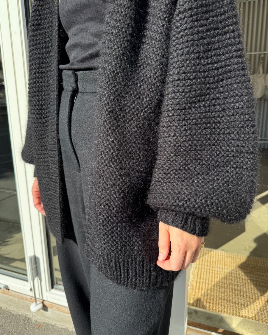 The body and sleeves are worked separately and seamed together, before stitches are picked up to create the continuous ribbed front bands and collar. This construction keeps the silhouette strong while allowing the jacket to drape effortlessly when worn.