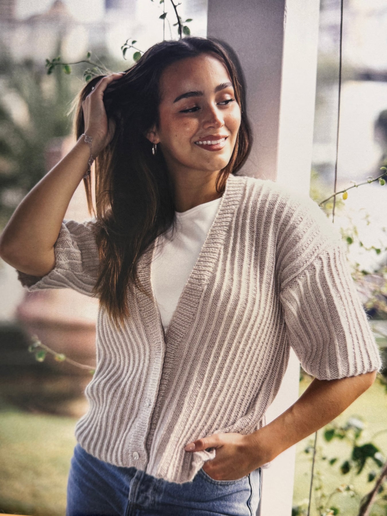 This stylish cardigan works up beautifully in Crucci 8ply, creating a soft, comfortable garment that's perfect for spring and summer layering. The ribbed stitch pattern creates lovely vertical lines that are both flattering and interesting to knit, while the deep V-neckline and relaxed sleeves give it a modern, casual elegance.
